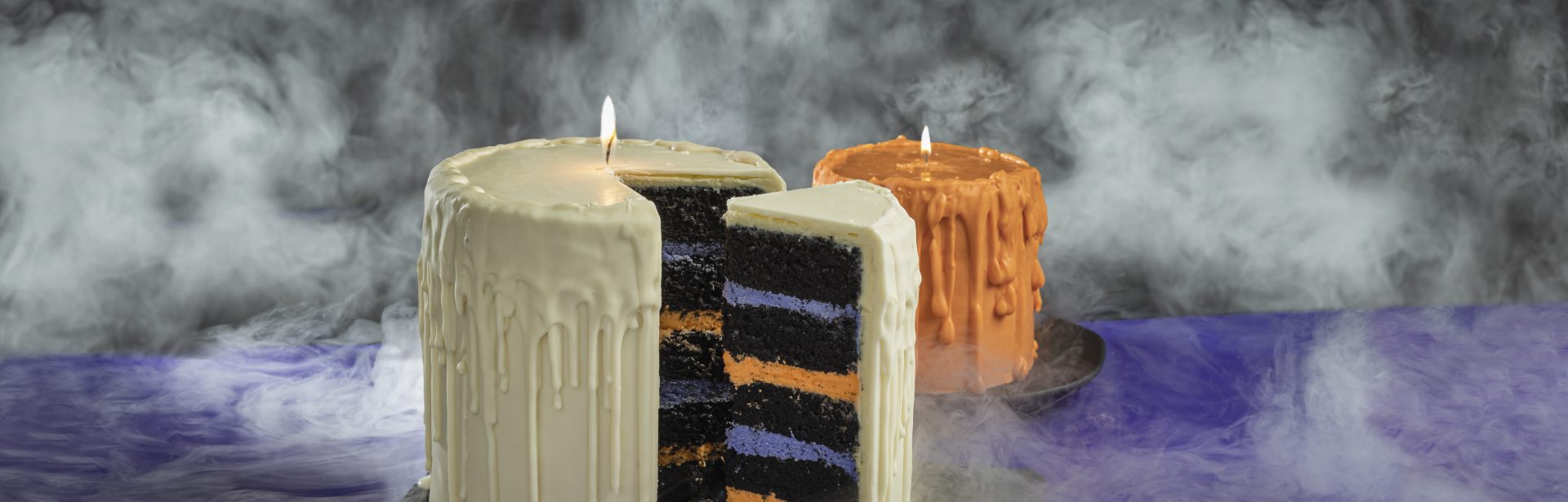 Forre um aro de metal de 15 cm com uma folha de plástico e intercale as massas com as ganaches cor de laranja e roxa, sempre umedecendo os bolos com calda em seguida leve à geladeira por 6 horas. Retire do aro e passe a ganache branca na lateral e no topo do bolo e então reserve. Derreta a Cobertura TOP Branca conforme as instruções da embalagem. Prepare um disco de Cobertura TOP Branca de 15 cm, seguindo a mesma técnica dos discos dos cupcakes e espalhe a Cobertura TOP Branca em um acetato da altura do bolo então envolva o bolo com o acetato com a cobertura ainda sem cristalizar.