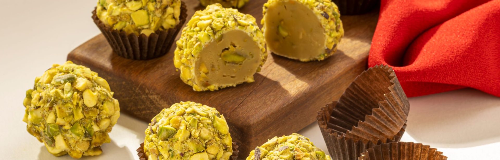 - Por fim, pese 20 g de massa de brigadeiro, enrole em forma de bolinhas e passe-as em pistache triturado para uma cobertura crocante e saborosa.
