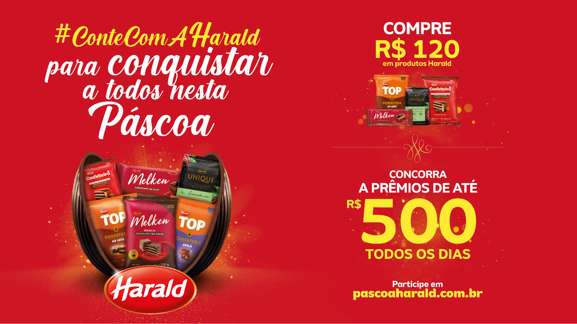 Já na modalidade “Compre e Concorra”, o consumidor poderá cadastrar sua nota fiscal, com o valor mínimo de R$120,00 em produtos Harald, e concorrer a prêmios instantâneos de R$50, R$100, R$200 e R$500 todos os dias, até o final da promoção. Para participar, basta acessar o site: www.pascoaharald.com.br