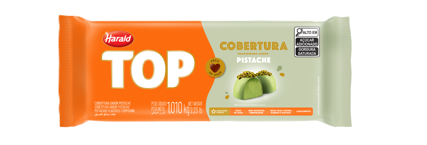 O TOP Pistache é uma cobertura feita com tecnologia inovadora que traz um surpreendente sabor. É indicada para moldar e banhar trufas, bombons, casquinhas, e doces da chocolataria em geral. Basta derreter para conseguir casquinhas mais finas e brilhantes. Rendimento até duas vezes maior do que com chocolate. Use também para banhar frutas secas ou frescas, pirulitos e biscoitos.
