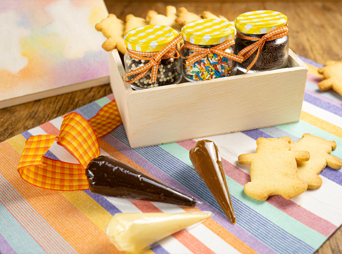 Montagem: em uma caixa forrada, disponha os biscoitos embalados, os sacos de ganache e as decorações em potinhos.