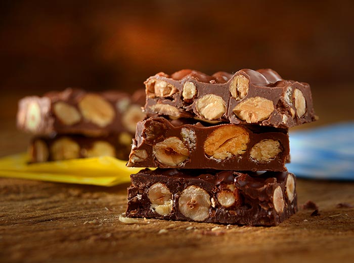 Derreta e tempere o chocolate. Incorpore os demais ingredientes ao chocolate temperado, misture bem e despeje rapidamente dentro da assadeira forrada com papel-manteiga, espalhando de maneira homogênea sobre toda a superfície. Dê leves batidas na assadeira sobre a mesa, para homogeneizar.