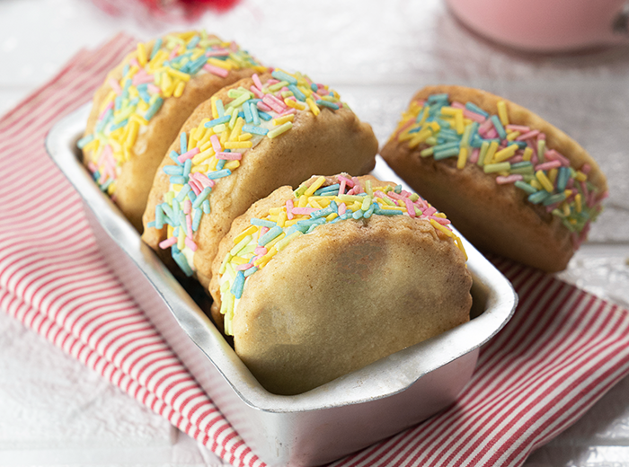 Tinja o Vermicelli Branco com as cores escolhidas e polvilhe na lateral dos biscoitos. Para vender, embale em saquinhos individuais de celofane.