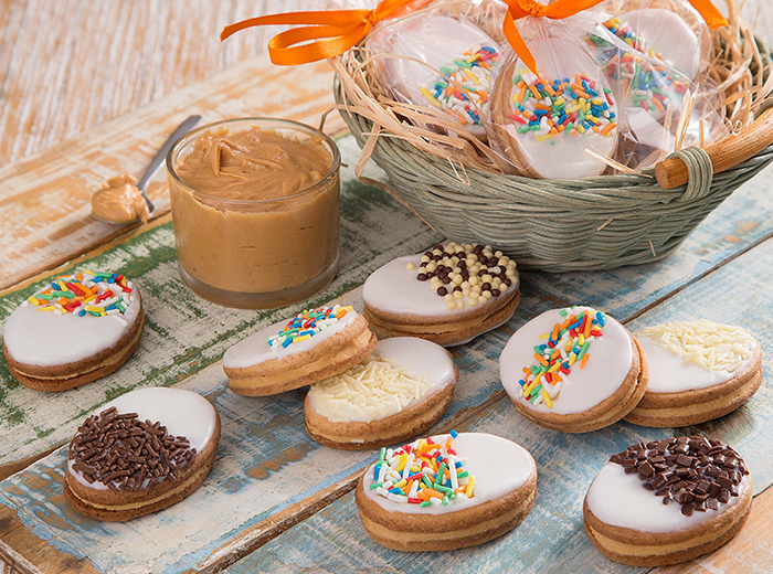 Para incluir os confeitos, faça uma camada fina de glaçagem e pressione os confeitos sobre ela. Faça o processo em metade dos biscoitos. Na outra metade, sem glaçagem, coloque 10 g de recheio e cole o biscoito decorado.