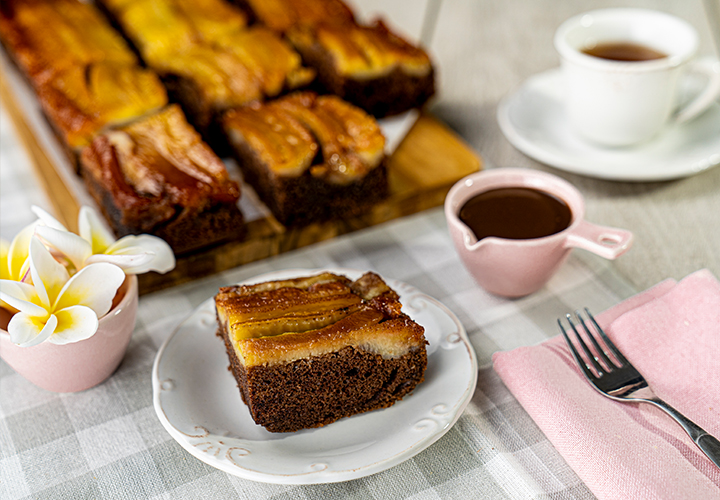 Despeje a massa sobre o caramelo e as bananas, leve a forno pré-aquecido a 180 °C até que ao enfiar um palito no centro da forma ele saia seco, sem resíduos de massa. Retire do forno e desenforme imediatamente.