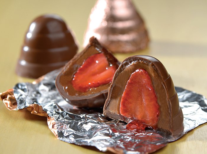 Faça as casquinhas de um molde de bombom grande com o Top ao Leite derretido. Preencha metade da cavidade dos bombons com o creme de brigadeiro. Depois, coloque um morango dentro de cada cavidade e termine de rechear com o creme de brigadeiro.