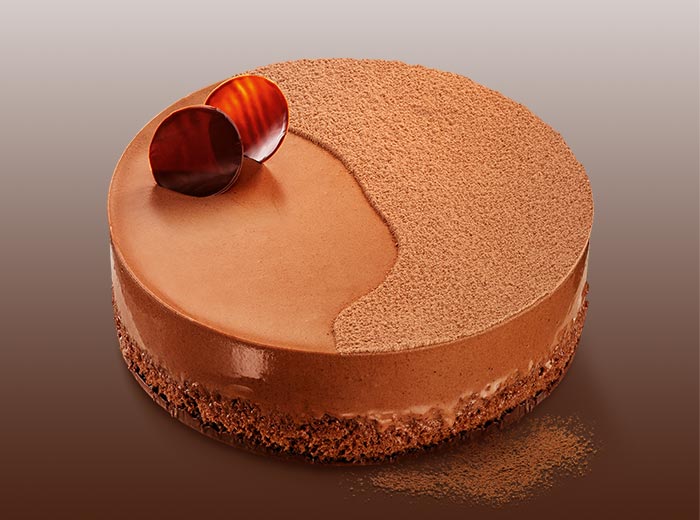 Montagem: mantenha o bolo na forma, somente soltando as bordas com uma faca ou espátula. Encaixe um fita de acetato ou papel-manteiga de 10 cm de altura nas laterais, entre o bolo e a forma. Despeje o creme sobre o bolo e leve ao freezer por 4 horas. Desenforme e coloque-o em um prato de servir. Divida a superfície do bolo com uma tira de acetato, formando uma curva. Finalize polvilhando o chocolate em pó em um dos lados, retire o acetato e decore com duas plaquinhas de chocolate. Mantenha no freezer até o momento de servir.