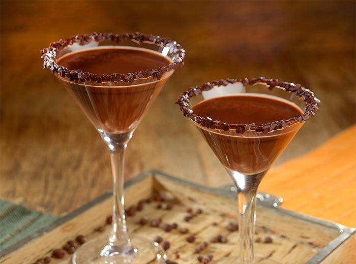 Decoração: antes de preparar a bebida, molhe delicadamente a borda de duas taças de martini na ganache fria e emborque-as sobre o um prato contendo o Granulé de Chocolate ao Leite Melken.