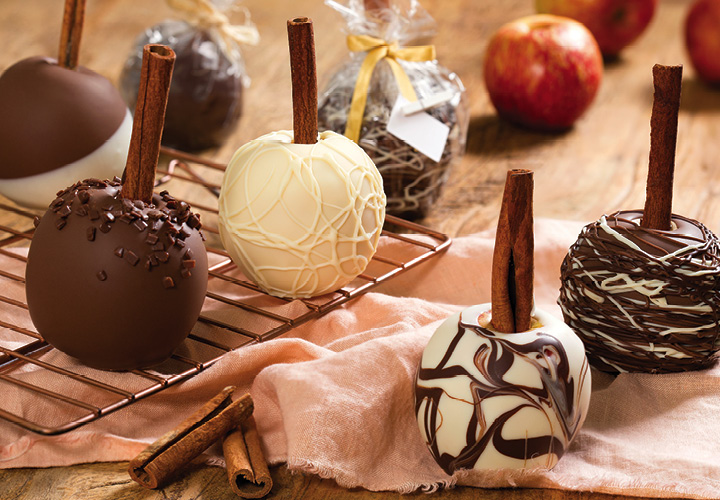 Lave e seque todas as maçãs. Retire com cuidado os cabos e encaixe em seu lugar uma rama de canela, pressionando para ficar bem presa. Caso tenha um pouco de suco de maçã próximo ao orifício onde foi colocada a rama de canela, seque com papel-toalha antes de banhar. Derreta as Coberturas Top em calor suave, no banho-maria ou no micro–ondas, e deixe-as em temperatura de trabalho (entre 38 °C e 42 °C). Banhe e decore seguindo as recomendações a seguir: