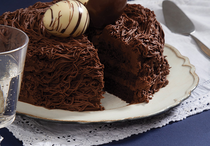 Decoração: passe o restante do recheio para uma manga de confeitar com bico tipo chuveiro. Faça movimentos circulares e contínuos por toda a superfície do bolo, inclinando-o se necessário para cobrir as laterais. Deixe em geladeira por pelo menos 1 hora para que a decoração ganhe estrutura. Retire da geladeira 30 minutos antes de servir e finalize com ovos ocos.