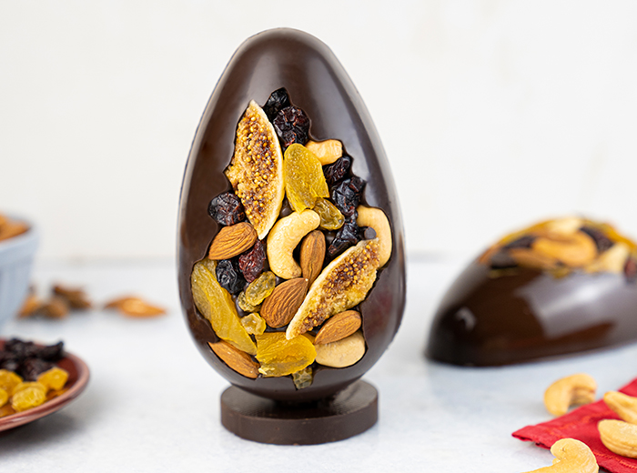 Disponha as frutas secas no centro interno dos moldes de ovo de Páscoa. Derreta e tempere o Melken 70% e transfira uma pequena quantidade para um cone de papel-manteiga. Utilize o cone para contornar as frutas secas e, então, faça riscos de chocolate temperado sobre elas, formando uma grade para impedir que elas se movimentem. Leve à geladeira apenas para secar.