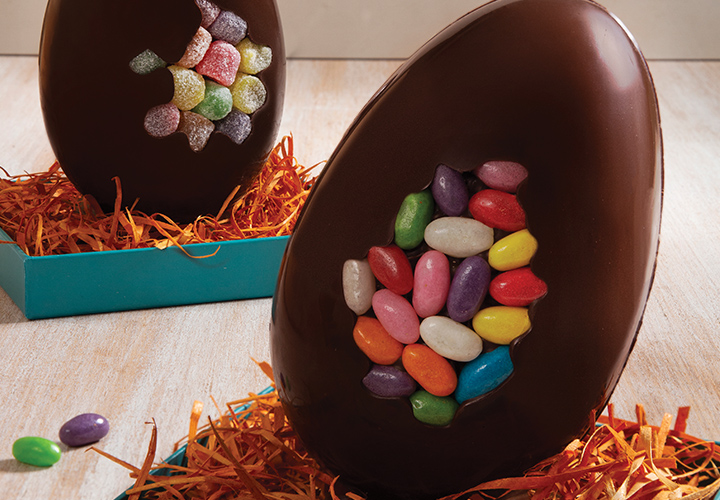 Disponha as jujubas dentro da forma de ovo. Derreta e tempere o Melken Meio Amargo e passe 100 g para uma manga de confeitar. Com o chocolate, cerque as jujubas e cubra-as em ziguezague, refrigerando por 3 minutos para evitar que se desloquem ou que escorra chocolate entre elas.