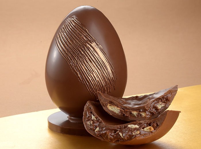 Decoração: mergulhe um pincel de cerdas largas em por um pouco de chocolate temperado e risque uma das faces do ovo. Deixe secar e, com a ponta do dedo, cubra os riscos com o corante em pó, formando um efeito de relevo.