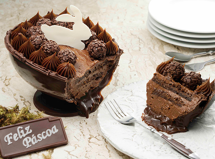 Finalize a decoração com placas de chocolate com desenho de coelhinhos e placas de chocolate com o dizer de Feliz Páscoa.
