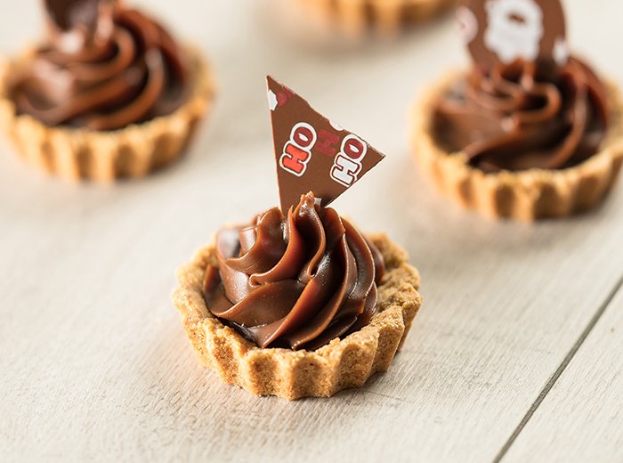 Finalização: coloque o Recheio e Cobertura Melken em um saco de confeiteiro com um bico pitanga e recheie as bases. Finalize com as plaquinhas de chocolate feitas com transfer.