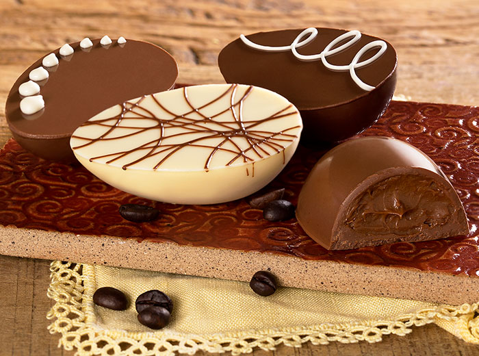 Montagem: preencha as casquinhas até quase a borda – use nos ovinhos feitos com blend os recheios de café e licor de cassis e, nos brancos, coloque a mousse de maracujá. Nivele os recheios com auxílio de uma colher. Feche os ovinhos com o restante do Top derretido.