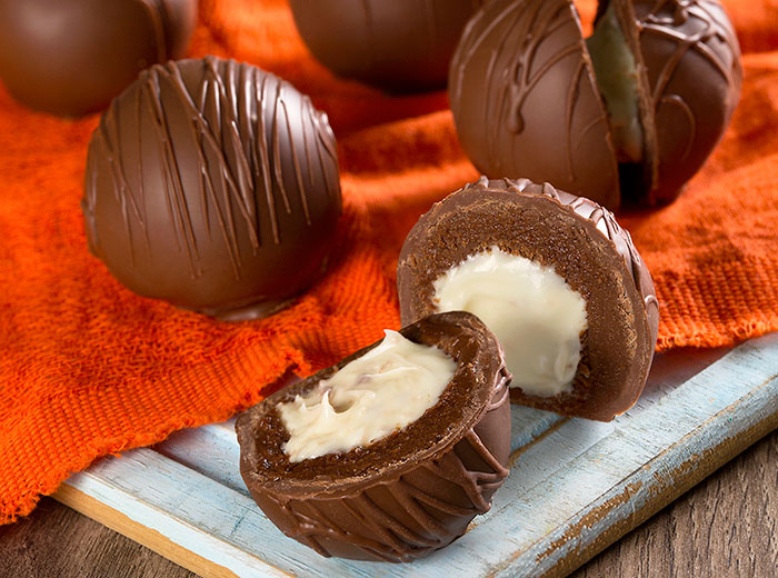 Derreta o Top Blend. Retire as trufinhas da geladeira e, com auxílio de um garfo de bombom, banhe-as uma a uma, dispondo-as sobre um papel-manteiga. Leve-as à geladeira apenas para secar a cobertura. Depois, com uma faquinha ou estilete, retire cuidadosamente o excesso das bordas. Passe o restante do Top para um cone de papel-manteiga, corte sua ponta e faça a decoração com movimentos de zigue-zague sobre as trufas. Espere secar e disponha-as em uma caixinha.