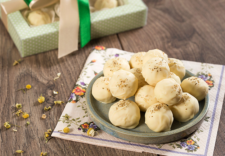 Faça uma segunda camada de chocolate, decore com o pó do chá de camomila e volte à geladeira por 3 minutos, ou até cristalizar. Armazene fora da geladeira, em potes hermeticamente fechados.