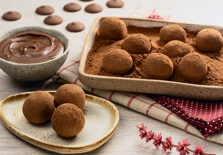 Outra variação possível é trocar a finalização no cacau em pó por um acabamento diferenciado: derreta e tempere 400 g de Melken Belga Meio Amargo e banhe utilizando a técnica de banho com as mãos. Disponha em placa forrada com papel-manteiga e leve à geladeira para secar. Depois de prontas, acomode-as em caixinhas.