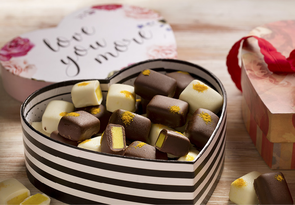 Banho e finalização: leve o Chocolate Melken escolhido ao micro-ondas (potência média), mexendo a cada 30 segundos até derreter completamente. Faça a têmpera, movimentando constantemente o chocolate até que ele atinja a temperatura de trabalho (29 a 30 °C para o meio amargo e 27 a 28 °C para o branco).