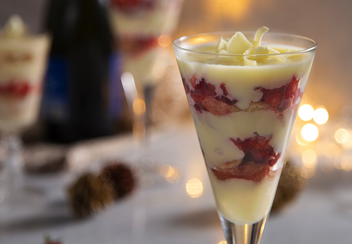 Montagem: pique os morangos, misture com o espumante e o açúcar e reserve por 30 minutos. Escorra os morangos, reservando o líquido para banhar os biscoitos.